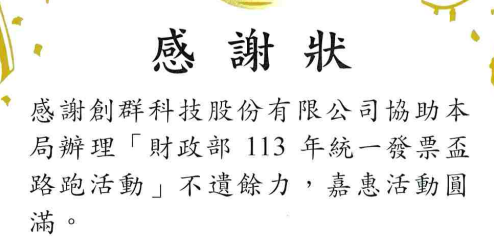 感謝頒發!財政部113年統一發票盃路跑活動感謝狀